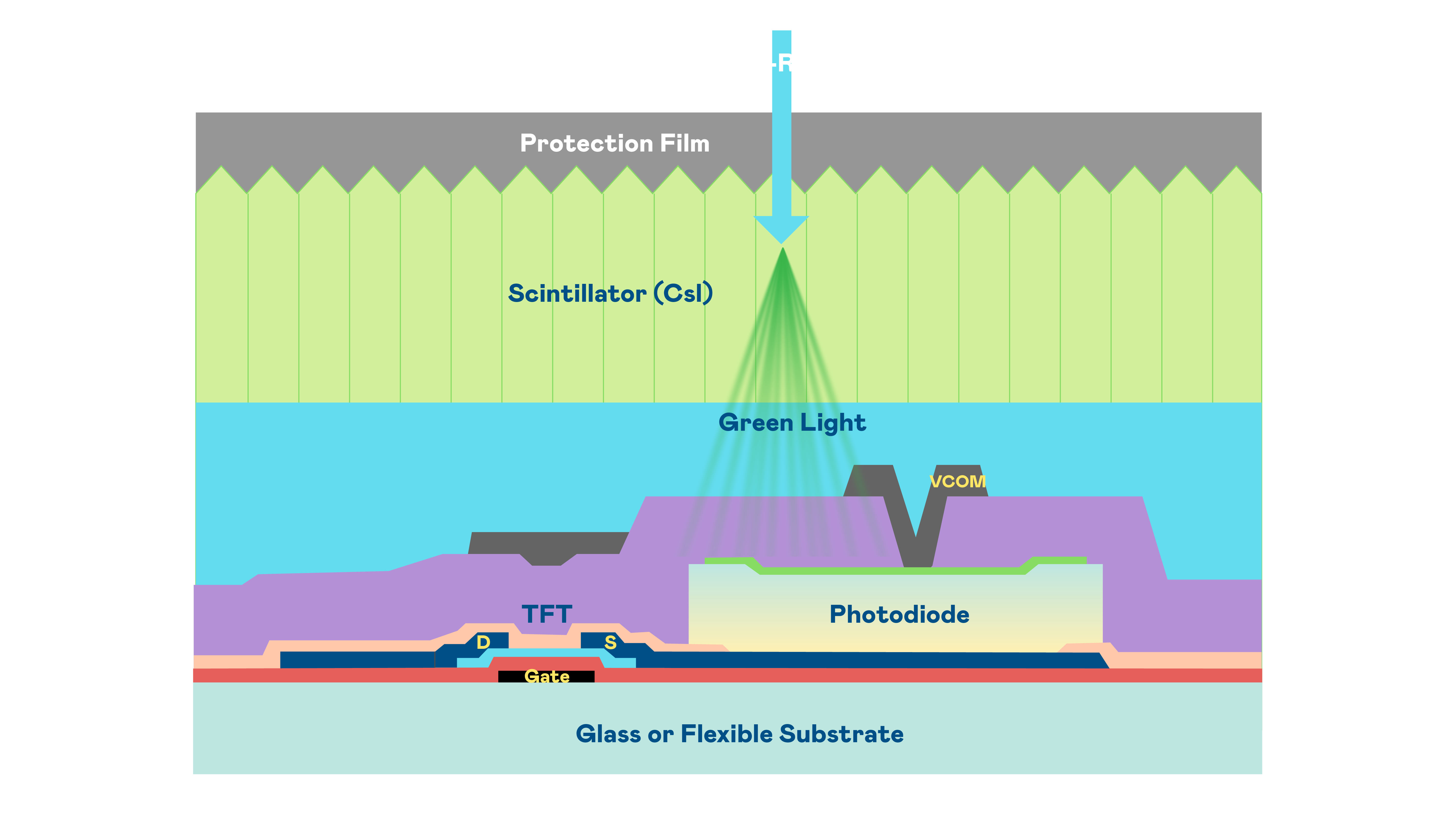 爱游戏网页版官方入口的X光影像感測陣列使用薄膜電晶體 (TFT) 作為每個像素的讀取開關,搭配光電二極體(Photodiode)的光電轉換元件,用以感測X光影像訊號。